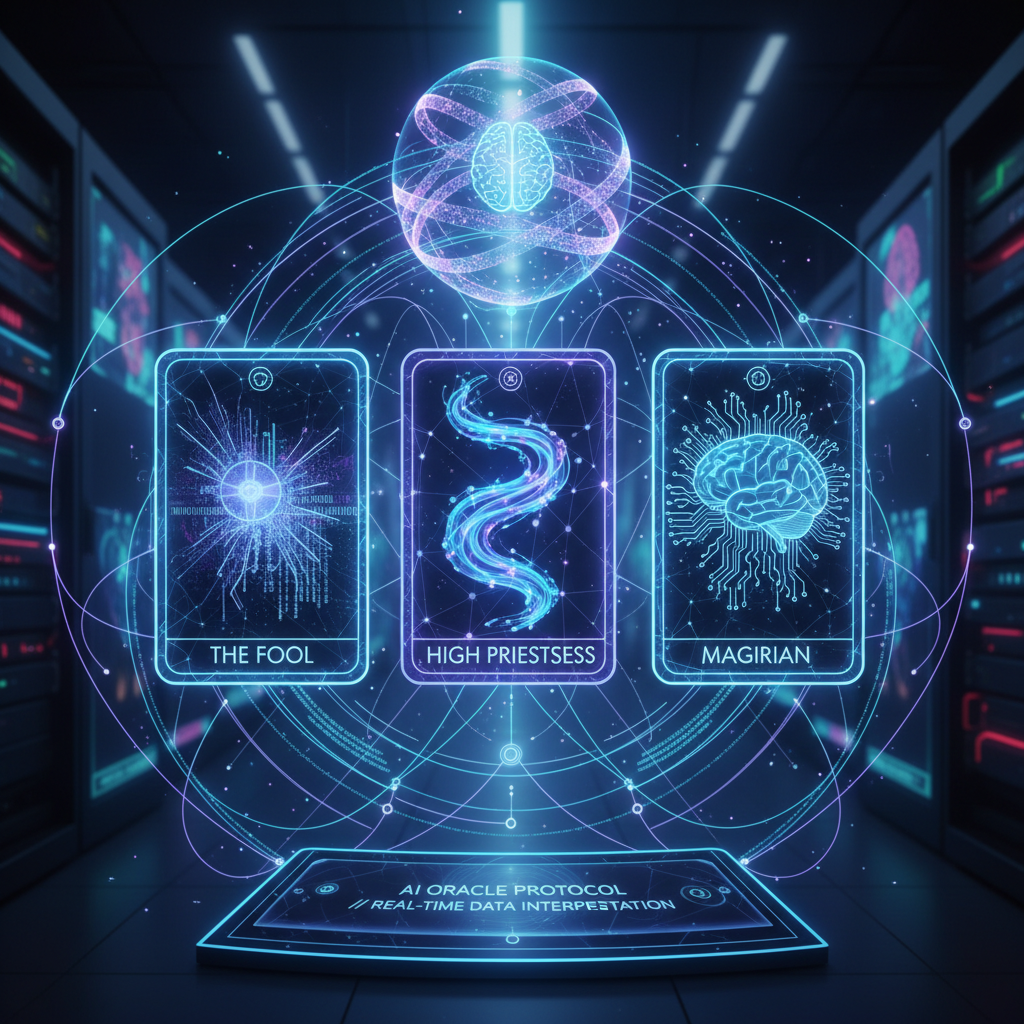 Digitale Tarot-Beratung, bei der künstliche Intelligenz Deutungen generiert. Ergänzt, aber ersetzt nicht die menschliche Intuition.
